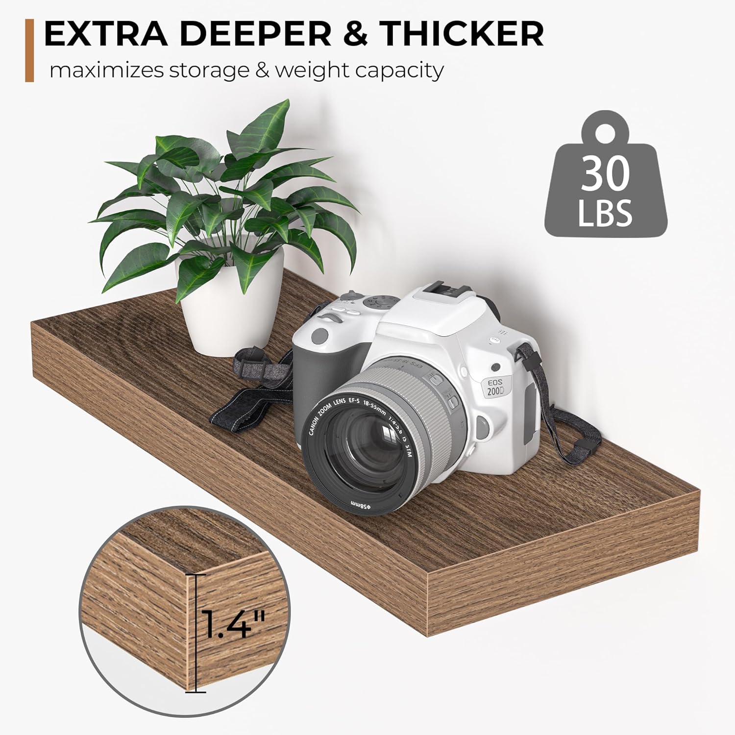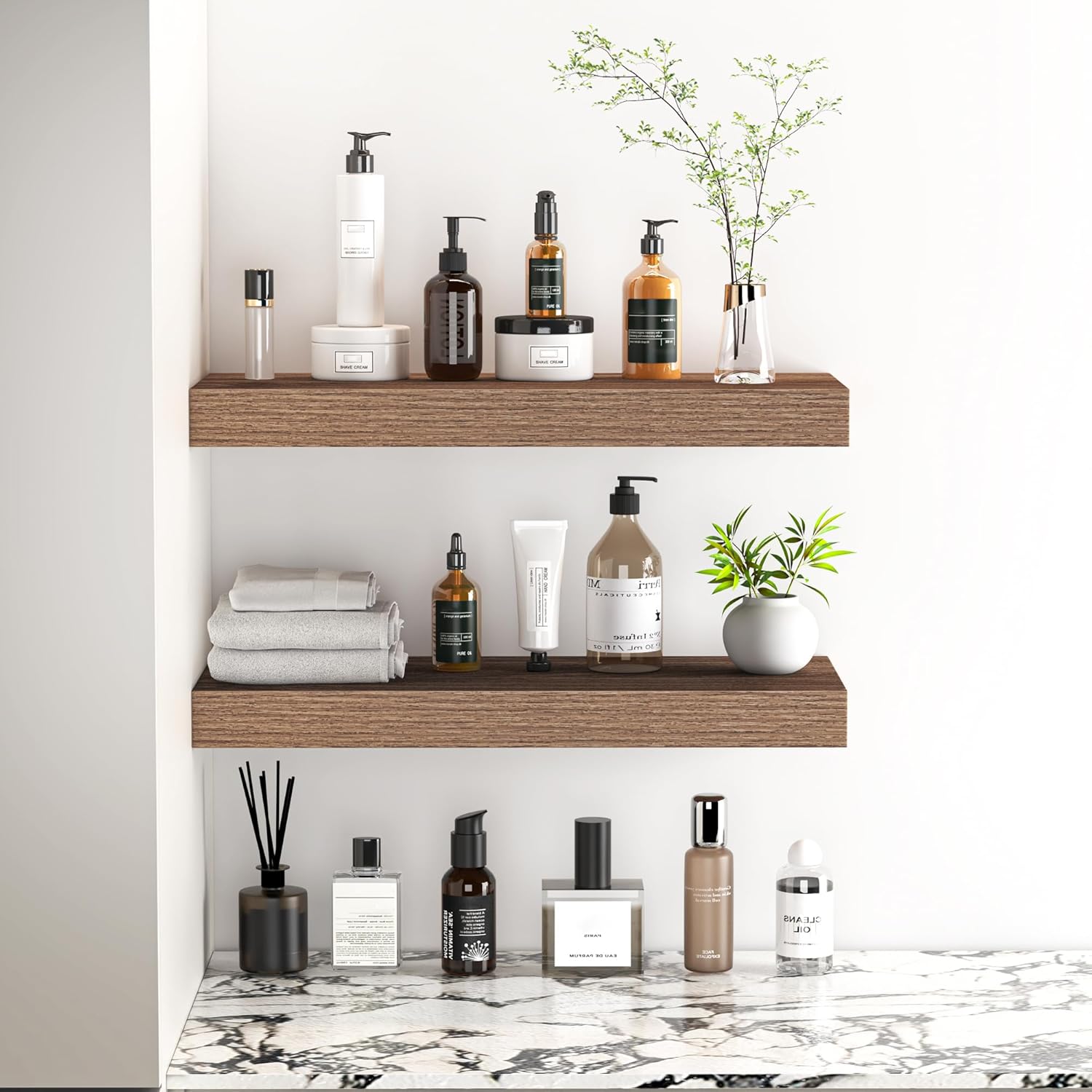 Enhance your home decor with these charming rustic floating shelves, designed to perfectly showcase your photo frames, small plants, models, collections, books, and awards.