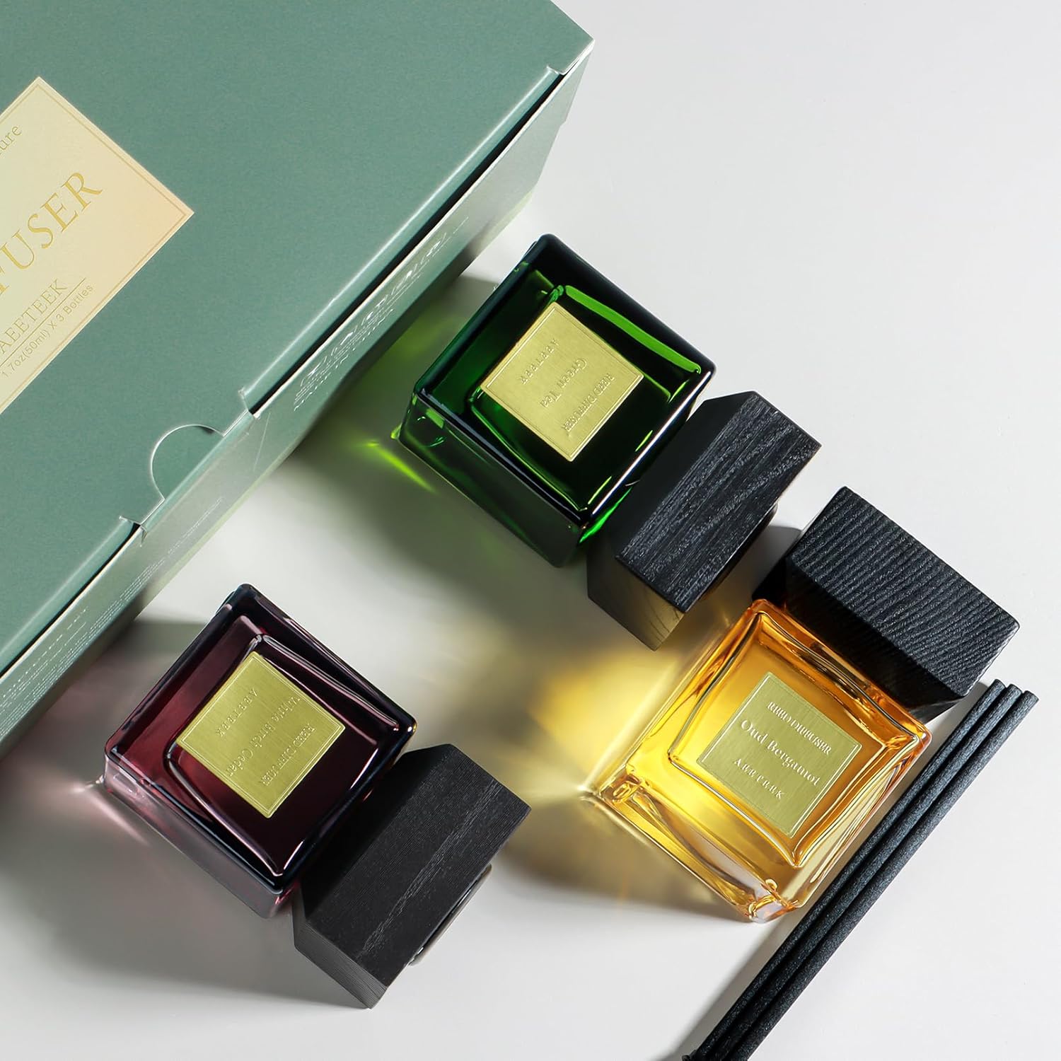 Reed Diffuser Set of 3, White Birch Cedar & Oud Bergamot & Green Tea Essential Oil with 15 Diffuser Sticks, Hotel Collection Bathroom Air Fresheners, 50ml Home Fragrance for Room Decor